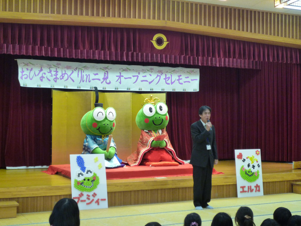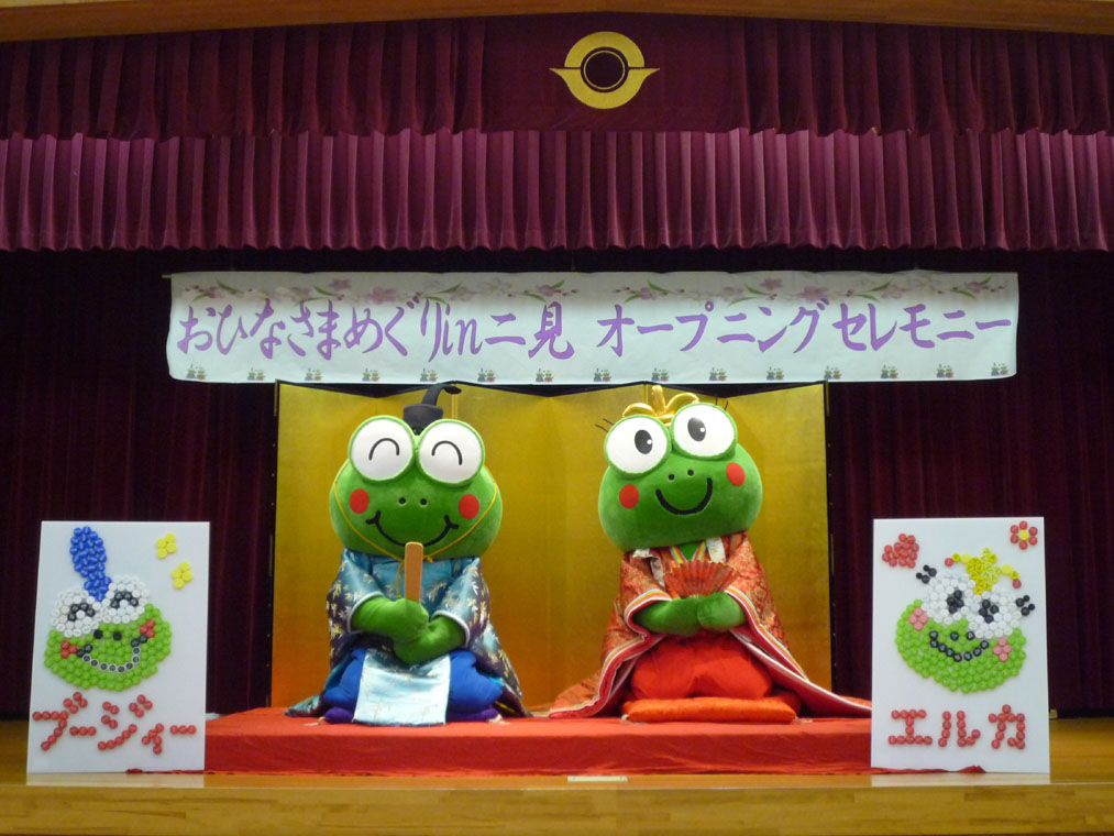 | いよいよ「おひなさまめぐりin二見」が開幕しました。 これから約1ヶ月、二見の街は、きれいなお雛様や花々で彩られます。 みなさん、是非お越し下さい。 ここでは、2月4日に行われましたオープニングセレモニーの様子を紹介します。 |